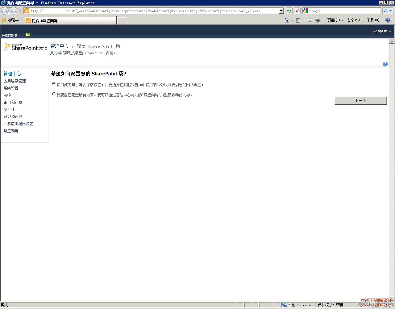 配置完成后,會啟動管理中心,開始服務器場的配置,這個比SharePoint2007智能一點: