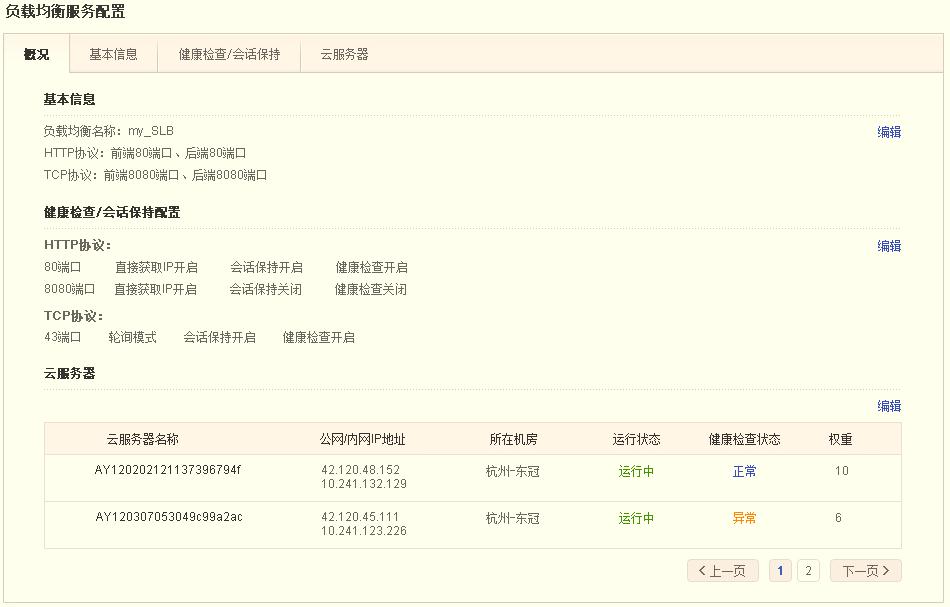 您可以查看該SLB實(shí)例的配置信息概況,您也可以點(diǎn)擊“編輯”鏈接對(duì)相應(yīng)的設(shè)置進(jìn)行變更和調(diào)整;具體的設(shè)置說(shuō)明同“創(chuàng)建SLB服務(wù)”相應(yīng)說(shuō)明。