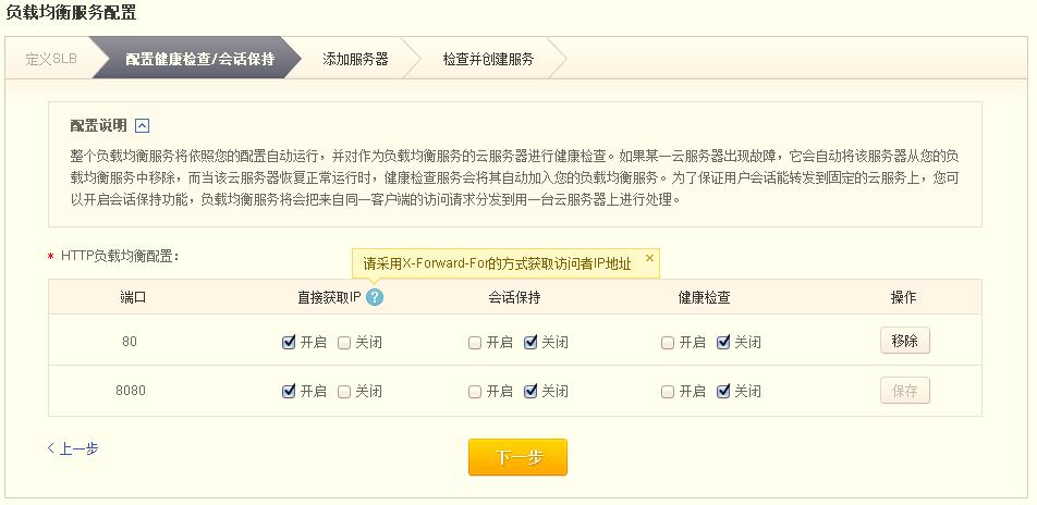 1、針對HTTP協議的SLB服務,您可以針對當前SLB實例下的不同服務端口進行“直接獲取IP”、“會話保持”和“健康檢查”配置;