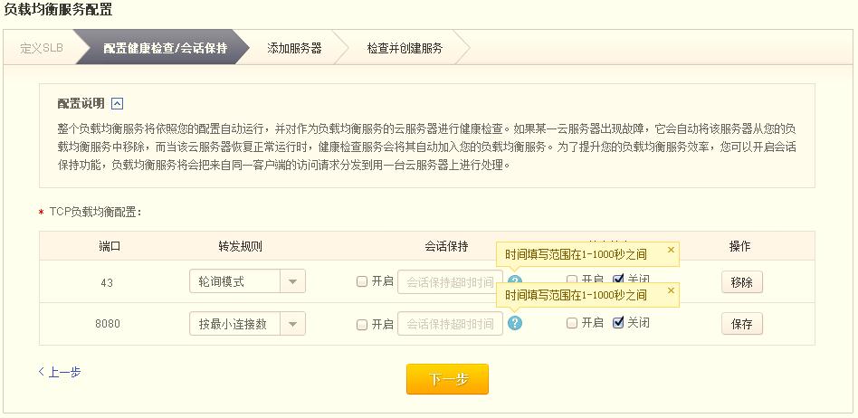 現在,您已經定義好了一個SLB實例的名稱、服務協議及服務端口號。接下來進行健康檢查及會話保持的相關配置。整個負載均衡服務將依照您的配置自動運行,并對作為負載均衡服務的云服務器進行健康檢查。如果某一云服務器出現故障,它會自動將該云服務器從您的負載均衡服務中移除,而當該云服務器恢復正常運行時,健康檢查服務會將其自動加入您的負載均衡服務。為了為了保證用戶會話能轉發到固定的云服務上,您可以開啟會話保持功能,負載均衡服務將會把來自同一客戶端的訪問請求分發到同一臺云服務器上進行處理。