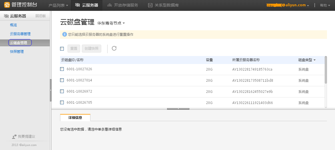 在“云服務(wù)器管理”頁(yè)中選擇一臺(tái)云服務(wù)器,在詳細(xì)信息中點(diǎn)選“擁有云磁盤(pán)”旁邊的“查看詳情”(如藍(lán)框線所示)。