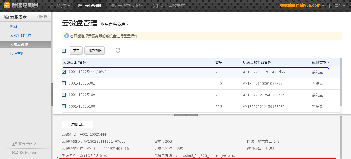點擊云磁盤列表中的一個云磁盤項(除復(fù)選框部分),見藍色框線部分,可以選中一個云磁盤。 選中后紅色框線部分自動展示這個云磁盤的詳細信息。