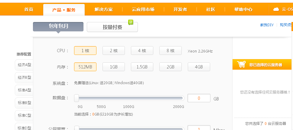 點擊右上方紅色框線內的“創建云服務器”按鈕,跳轉到云服務器購買頁面。