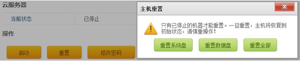 1、在云服務器狀態為:已停止時,點擊重置按鈕。