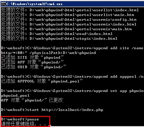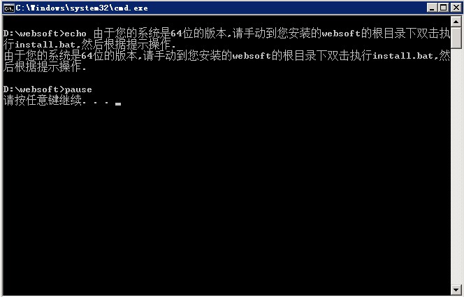 完成后會(huì)出現(xiàn)一個(gè)命令行界面,不用擔(dān)心,上面會(huì)提示手動(dòng)到您安裝的websoft的目錄,執(zhí)行install.bat