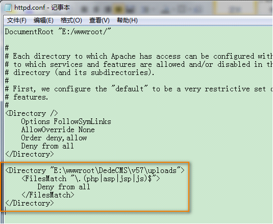 配置內容中的DIR為需要限制執行腳本文件的目錄,FilesMatch后的內容為需要限定的執行的腳本后綴名。例如:這里需要禁止測試站點uploads文件夾下的PHP,ASP,JSP腳本的運行,則進行如下圖6配置:
