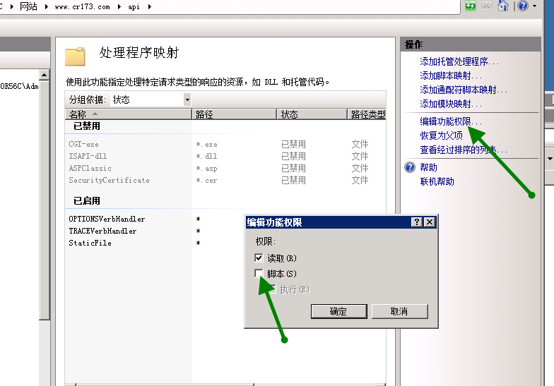 1、先選擇需要取消權限的目錄,然后在右邊可以看到 “處理程序映射” 雙擊打開。