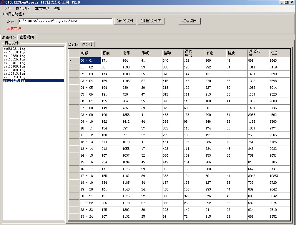 6:除了按狀態碼分析,切換“24小時”,還可以按時段進行分析,右側按時段顯示24小時的各搜索引擎和非搜索引擎訪問情況,如下圖: