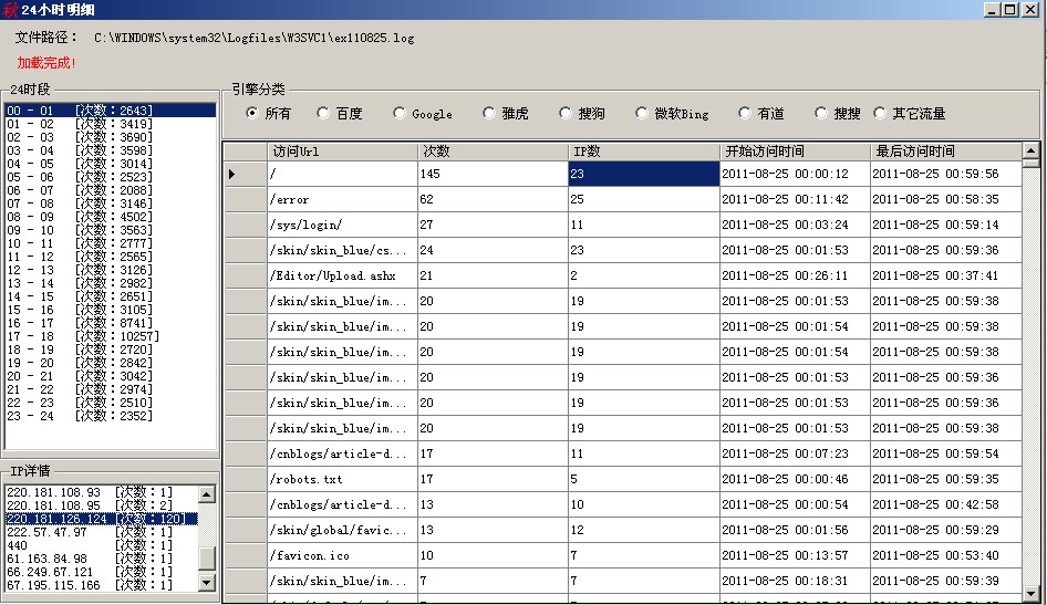 7:雙擊“24小時”列表單元格內的信息,將彈出“24小時明細”,進行時段內更詳細的分析,如下圖,也可以按“搜索引擎分類”顯示,單擊列表單元格信息,也可顯示IP詳情,雙擊IP詳情,同樣會彈出網頁顯示IP地址。