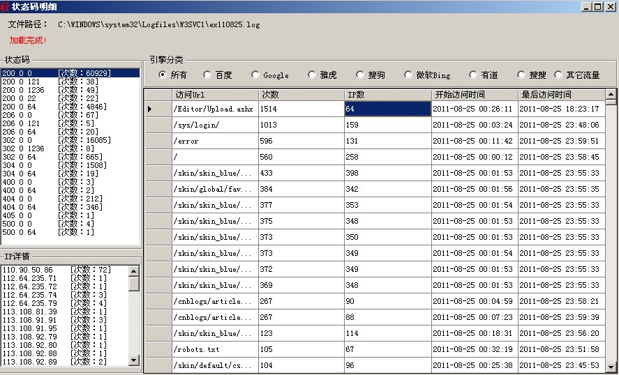 5:雙擊“狀態碼”單元格,將進入“狀態碼明細”分析,可針對單個狀態碼進行分析,同時右側,還可以按“搜索引擎分類”顯示,點擊右側“列表單元格”,將在左側下方顯示IP詳情,雙擊“IP詳情”項,將彈出網頁顯示IP的所在地,如下圖: