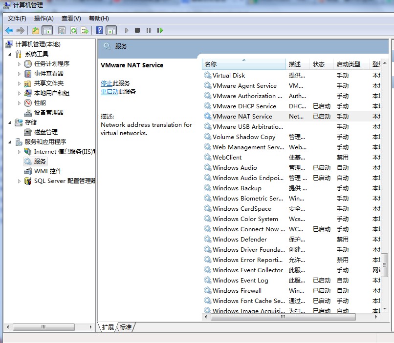 3、然后右鍵點擊我們的電腦,進入到管理界面 計算機-> 管理->服務和應用程序->服務,找到如下服務進程 VMware DHCP Service, VMware NAT Service。 分別點擊右鍵->啟動
