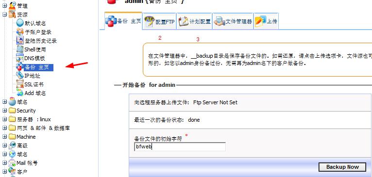 這都是中文操作我就不一步一步截圖了,看上圖的數字標識操作,先找到備份選項,設置備份字符,然后設置遠程FTP信息
