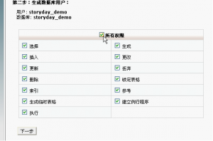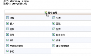 接下來是添加用戶權限,也就是正在創建的用戶,對數據庫storyday_demo能有哪些操作權限,如果你不知道如何設置,可以全選: