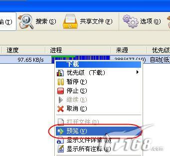 第二步:使用電驢下載視頻文件,待下載到一定數(shù)據(jù)量時,右鍵單擊正在下載的任務,在彈出的快捷菜單中選擇"預覽"(如圖2),這時電驢便會自動調(diào)用Kmplayer預覽正在下載的視頻文件的臨時文件。 圖 2 預覽視頻文件
