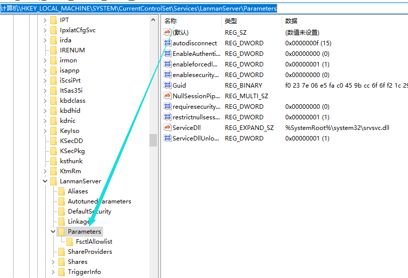 打開注冊表編輯器,在左側欄依次點擊展開【HKEY_LOCAL_MACHINE/SYSTEM/CurrentControlSet/Services/LanmanServer】,找到【Parameters】,