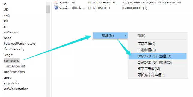 選擇【Parameters】,在右側窗口空白處點擊右鍵,彈出菜單,點擊【新建】——【DWORD(32位)值】,設置名稱為AutoShareServer,
