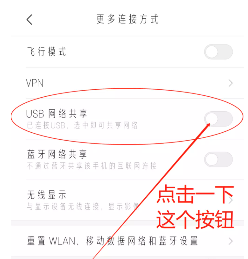 進入以下界面,找到【USB網絡共享】選項,點擊將其打開,按鈕變為綠色,說明已經打開網絡共享,臺式電腦可以通過數據線使用手機流量,上網沖浪,
