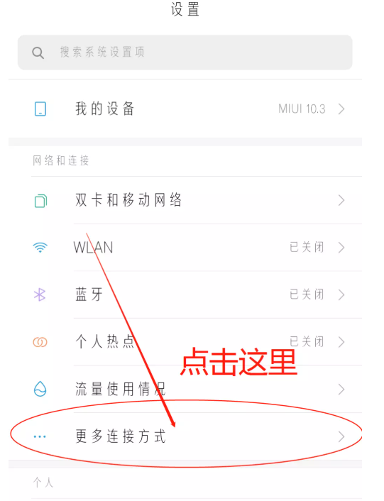 現在進入手機設置界面,如圖,點擊【網絡和連接】——【更多連接方式】,