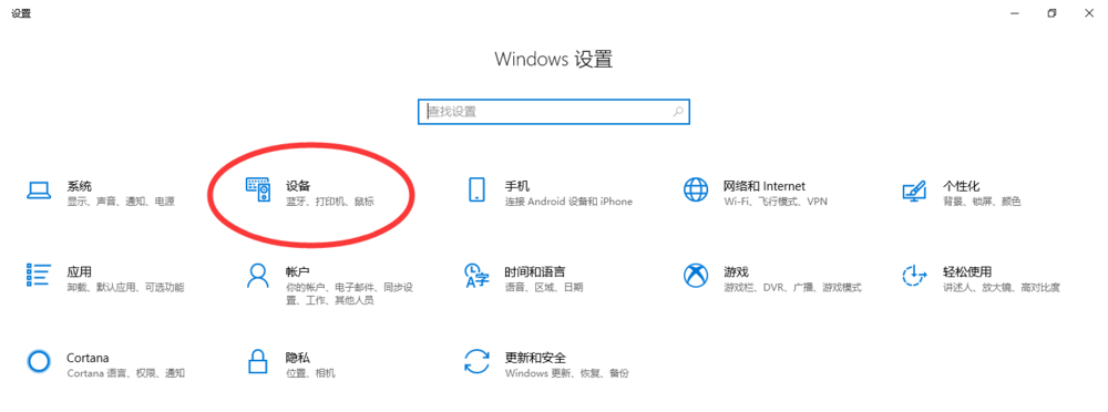 以Win10系統為例,呼出開始菜單,點擊【設置】,如圖,進入Windows設置中心,點擊【設備】選項,