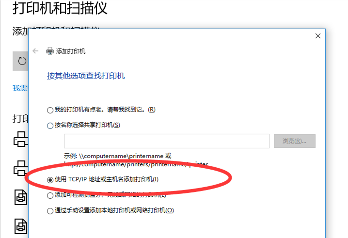 彈出新窗口,如圖,選擇【使用TCP/IP地址或主機名添加打印機】,繼續下一步,