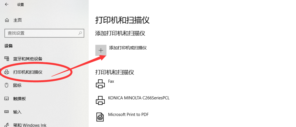 在左側窗口點擊【設備】——【打印機和掃描儀】,接著點擊【添加打印機或掃描儀】,如圖,