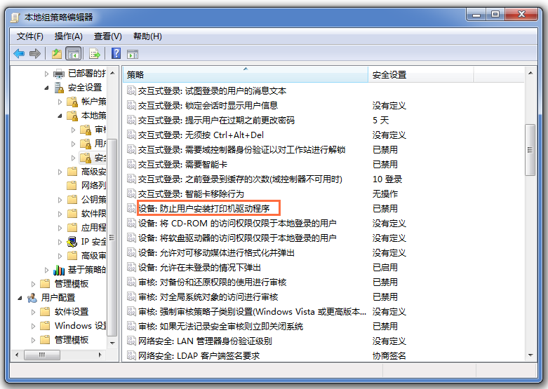 1、按快捷鍵【Windows+R】,彈出運行對話框,輸入gpedit.msc,打開本地組策略編輯器,然后依次點擊【計算機配置】—— 【Windows設置】——【安全設置】——【本地策略】——【安全選項】,找到【設備:防止用戶安裝打印機驅動程序】,確保處于已禁用狀態,如圖,