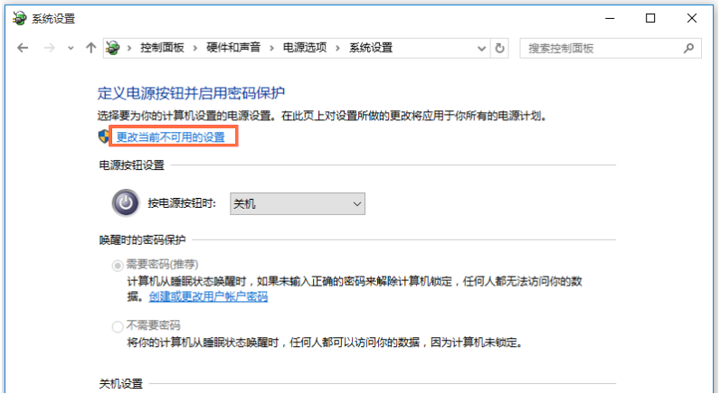 4、然后進入系統設置界面,先點擊【更改當前不可用的設置】,然后勾選【啟用快速啟動】,點擊保存修改即可。