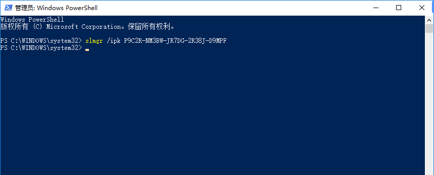 打開命令提示符窗口,輸入slmgr /ipk P9C2R-NM3BW-JR7DG-2R38J-D9MPF,按回車鍵,