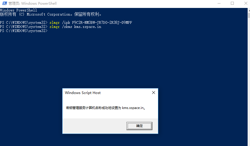 輸入slmgr /skms kms.xspace.in,設置激活名稱,回車,出現提示,