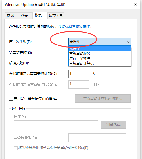 然后點擊【恢復】,第一次失敗選擇無操作,點擊確定,即可關閉Windows自動更新。