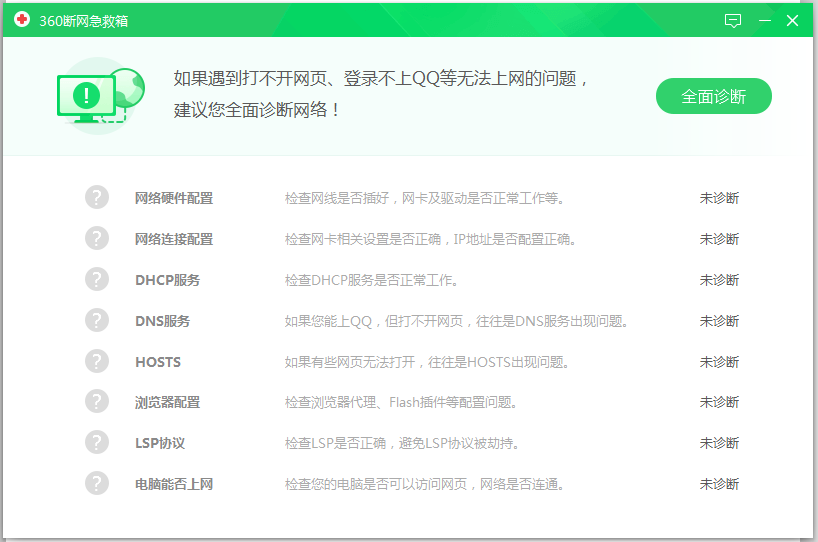 進入界面,點【全面診斷】,開始修復網絡,修復完成,重啟電腦,即可正常連接網絡,
