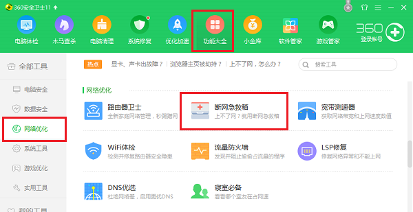 打開360安全衛士,點擊【功能大全】——【網絡優化】——【斷網急救箱】,