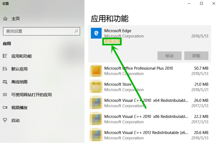 進入【應用和功能】界面,點擊右側的【Microsoft edge】,然后選擇【高級選項】,