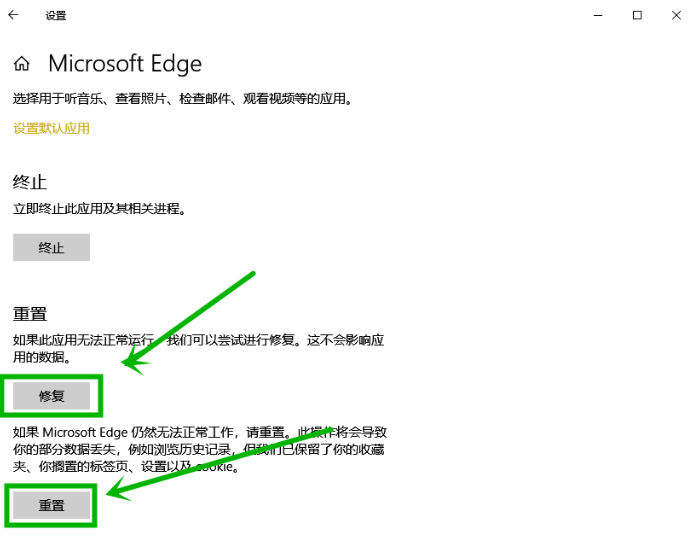 進入設置界面,找到【修復】和【重置】選項,分別操作,可以對瀏覽器進行修復重置,