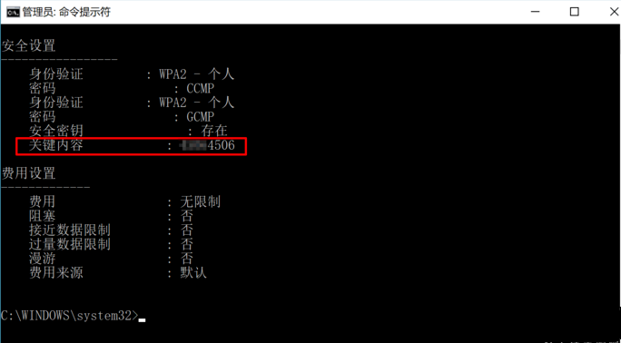 然后按下回車,點擊安全設置——關鍵內容這一欄,就會顯示該WiFi熱點對應的密碼。