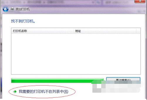如果耐心地等待后系統還是找不到所需要的打印機也不要緊,也可以點擊【我需要的打印機不在列表中】,然后點擊【下一步】,如下圖。