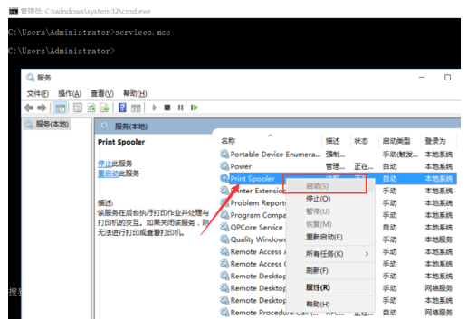 打開服務界面,找到與打印機相關的服務“Print Spooler”,如果此服務沒有正常開啟,右擊此服務項選擇“開啟”即可。