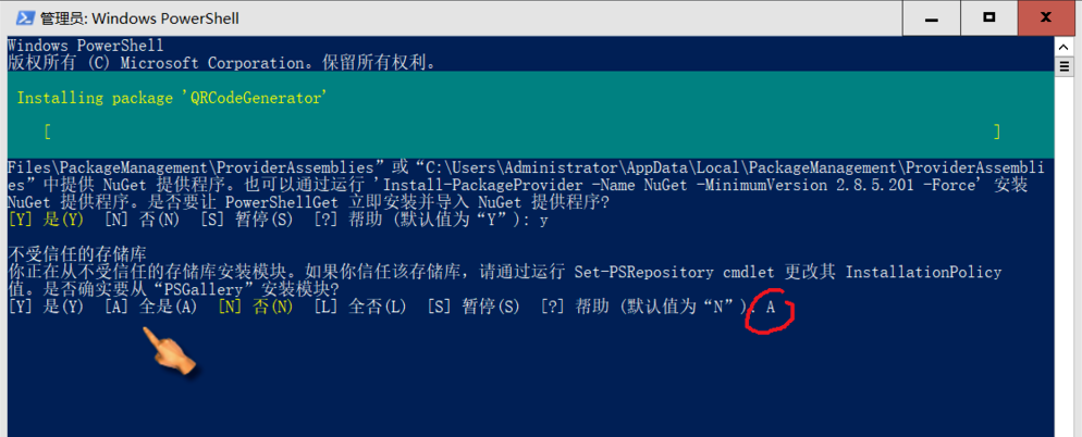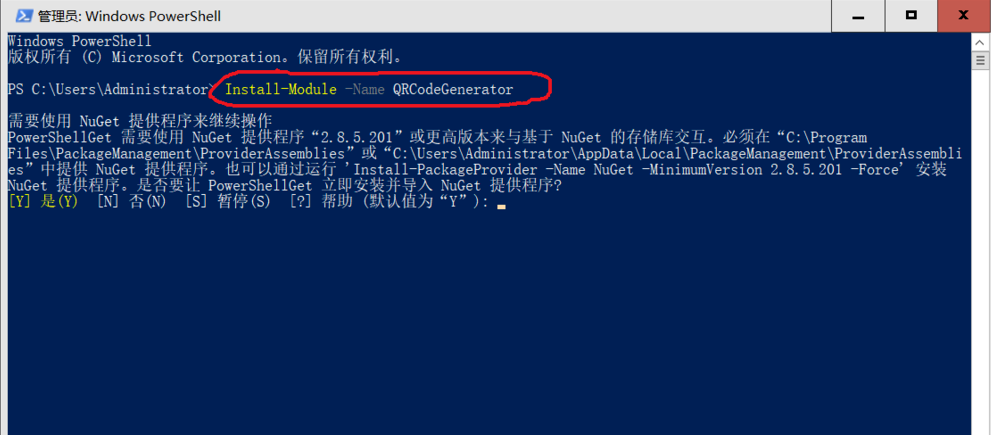 輸入“Install-Module -Name QRCodeGenerator”并回車。