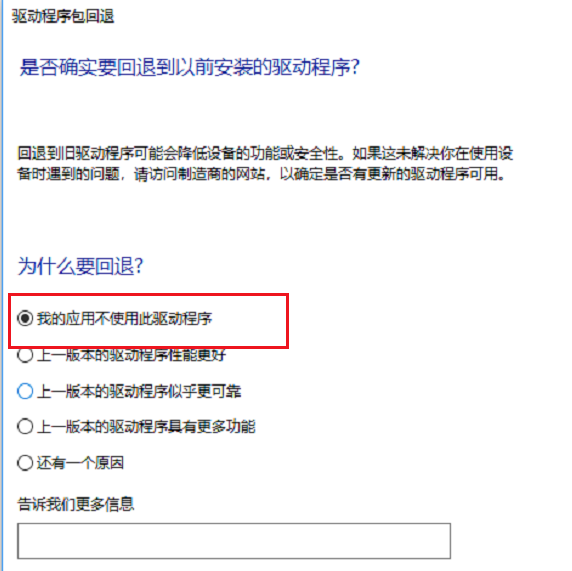 點擊回退驅動程序,會讓你選擇原因,回退之后,點擊是,如下圖所示: