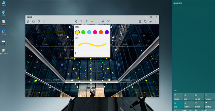 除此之外,截圖面板也和之前版本大不相同,除了將浮動窗口轉變為頂端固定式外,新版只保留了“區域截圖”、“自由截圖”、“全屏截圖”、“退出”四個按鈕,清爽且更利于操作。同時Win10還將快捷按鈕放置在了通知中心下方的快速面板中,相比以前更加得心應手。