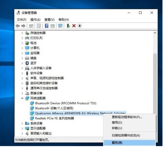 3、點擊展開“網絡適配器”,然后在無線網卡名稱上點擊鼠標右鍵,繼續打開“屬性”,如圖所示。