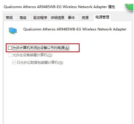4、最后在打開的無線網卡屬性中,切換到“電源管理”選項,然后將【關閉允許計算機關閉此設備以節約電源】前面的勾選去掉,完成后,點擊底部的“確定”保存設置即可。