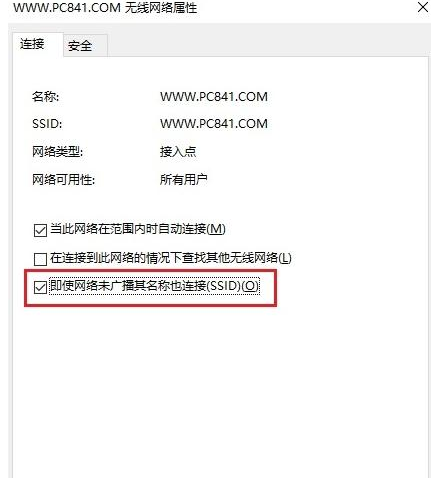 方法二:勾選“即使網絡未廣播其名稱也連接(SSID)”