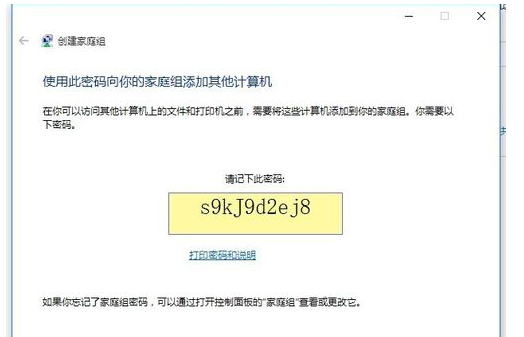 待創(chuàng)建“家庭組”完成后,將彈出如圖所示的“家庭組密碼 ”界面,記下此家庭組密碼,用于將其它計算機(jī)通過“家庭組密碼”添加到本家庭組中,以實(shí)現(xiàn)文件共享訪問功能。