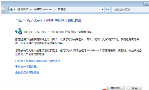 打開“控制面板”,點(diǎn)擊“家庭組”項進(jìn)入,此時Win7將自動檢測局域網(wǎng)電腦所創(chuàng)建的“家庭組”網(wǎng)絡(luò),如圖所示,點(diǎn)擊“立即加入”按鈕。