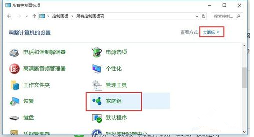 待打開“控制面板”界面后,將“查看方式”設(shè)置為“大圖標(biāo)”,并從此界面中找到“家庭組”項點(diǎn)擊進(jìn)入。
