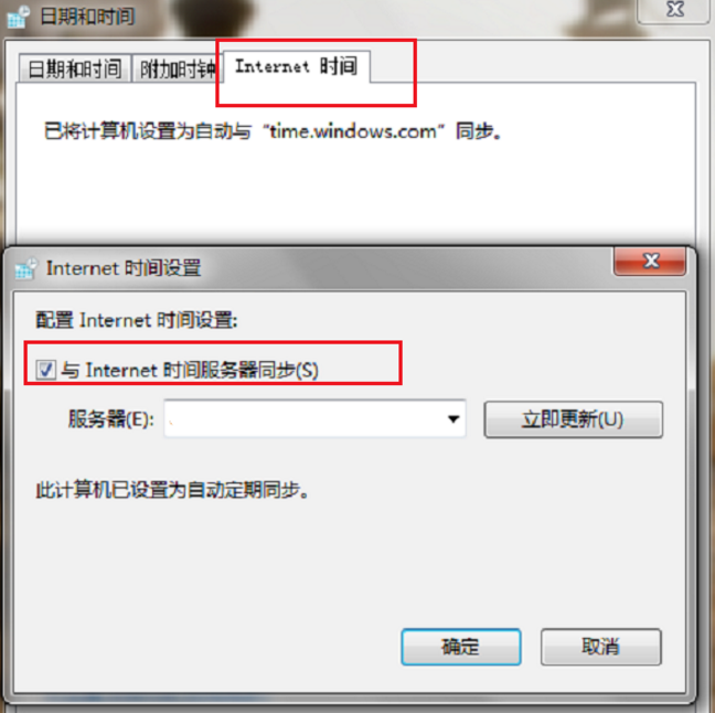 6、調整時間為當前的時間之后,點擊Internet時間中的更改設置,勾選“與Internet時間服務器同步”,點擊確定,這樣時間就可以進行同步了,如下圖所示: