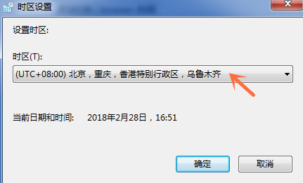 3、進去時區設置界面之后,將時區更改為“(GMT+08:00)北京,重慶,香港特別行政區,烏魯木齊”,點擊確定,如下圖所示: