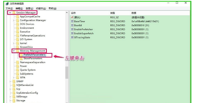 8、在Control項中找到:SessionManager,并依次展開SessionManager/MemoryManagement,在MemoryManagement展開項中找到:PrefetchParameters,并左鍵單擊:PrefetchParameters;