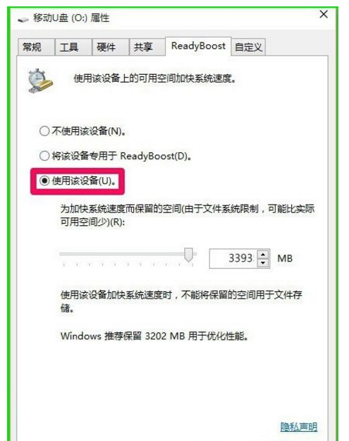 4、檢索設備ReadyBoost信息以后,如果U盤可以用于使用該設備上的可用空間加快系統速度,則會出現下面的對話框,點擊“使用該設備(U)”,然后點擊“應用”;